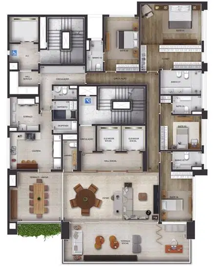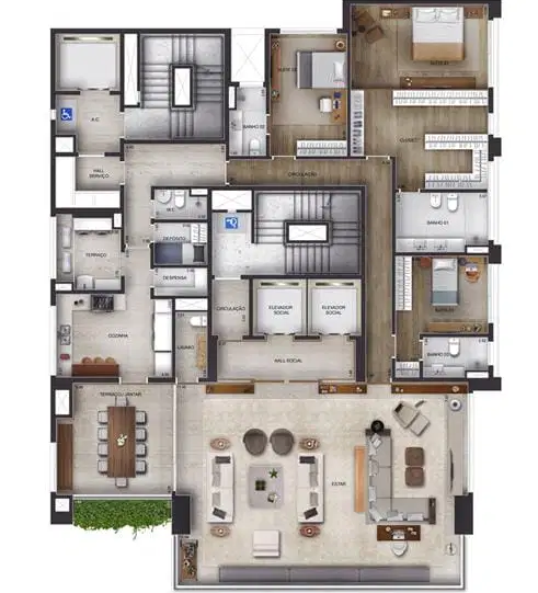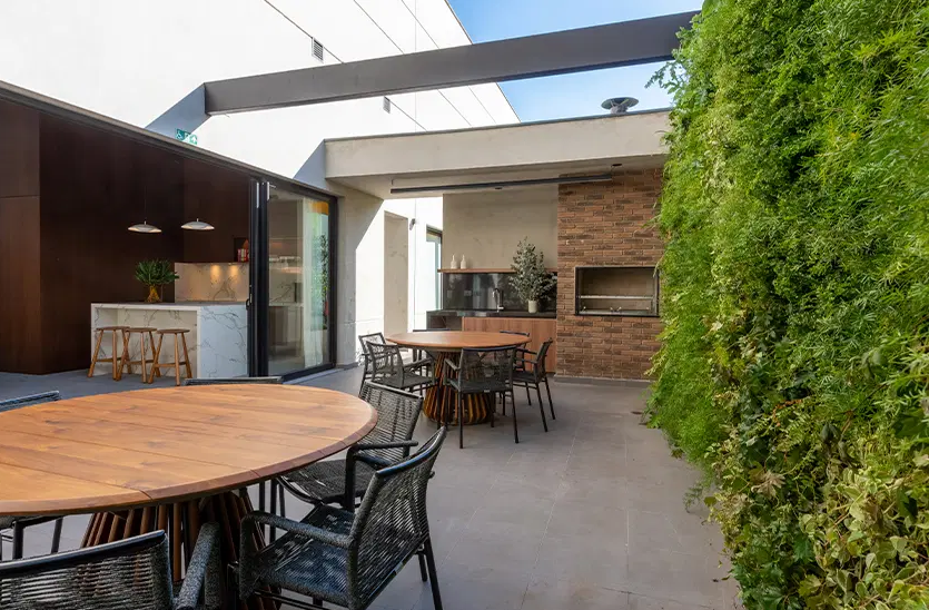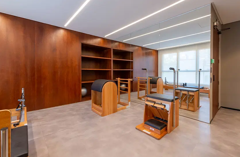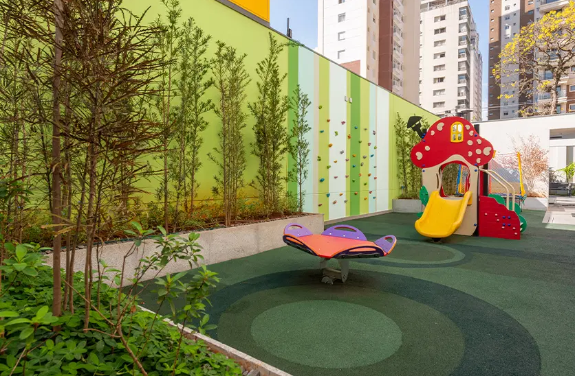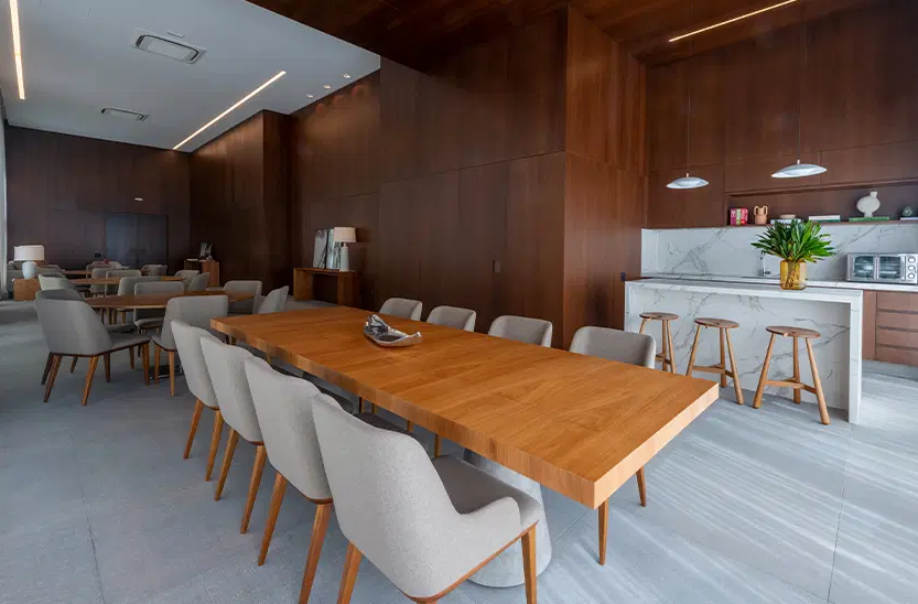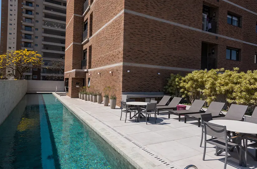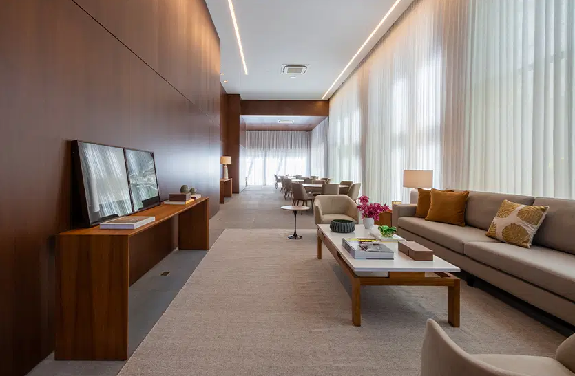 O empreendimento oferece uma infraestrutura completa de lazer, incluindo piscina com raia de 25 metros, academia equipada, sala de pilates, miniquadra poliesportiva, salão de festas, brinquedoteca, playground e espaço para churrasco, tudo projetado para proporcionar conforto e bem-estar aos moradores. Os acabamentos são de alto padrão, com pisos em mármore Travertino Romano, esquadrias de alumínio com alto desempenho acústico e térmico, além de infraestrutura para automação residencial. Algumas unidades são entregues no modelo "porteira fechada", já mobiliadas com peças assinadas por designers renomados, garantindo sofisticação e praticidade.